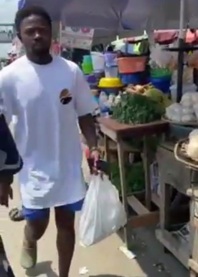 bustling market scene, likely in an African or Caribbean locale. The camera moves through the market, passing stalls filled with goods. There are people walking around, some interacting with vendors. We see stalls laden with items such as plastic bowls stacked in colorful piles, white root vegetables, and bundles of greens. There are also signs indicating POS (Point of Sale) services available. The environment appears sunny and crowded.