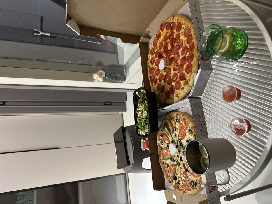 The image depicts an indoor scene in a modern residence in Yiwu, China, set for a meal. On a white, ribbed circular table, two large pizzas in open cardboard boxes are prominently displayed. The pizza on the right is a pepperoni pizza, and the pizza on the left is topped with red tomato slices, green peppers, and black olives. Both pizzas contain a white plastic pizza saver in their centers. The pizza boxes are marked "88 PIZZA" and include Chinese text such as "专业外送!" (Professional delivery!). Adjacent to the pizzas, a black plastic container holds a salad, featuring green leaves, feta cheese cubes, and other vegetables, garnished with a lemon wedge. Two small, clear plastic cups, each containing a reddish liquid, are also on the table. Beverages include a light pink/beige insulated mug holding a clear liquid with lemon slices, and a green, textured glass containing a similar clear liquid with lemon slices. In the background, a dark grey stool supports a dark tablet and a dark smartphone. The room features light-colored walls and minimalist built-in cabinetry. A large window or glass door on the right reveals a blurred reflection of the interior and a faint outline of a cleaning tool outside. A small blue vase holding three faux pink and white roses is situated on a windowsill or ledge. No individuals are visible in the scene.