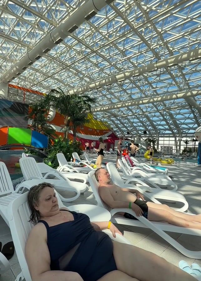 brightly lit indoor water park. There are a few people lying on white plastic lounge chairs. A woman in a dark swimsuit is lying on a lounge chair in the foreground with her eyes closed. To her right, a man with short brown hair is also lying on a lounge chair. He is wearing dark swim trunks and is shirtless. In the background, other people are walking around or lounging in the water park. There are palm trees, colorful structures, and water slides. The roof of the water park is made of a grid of white beams and glass panels, allowing sunlight to filter in. The camera is stationary.
