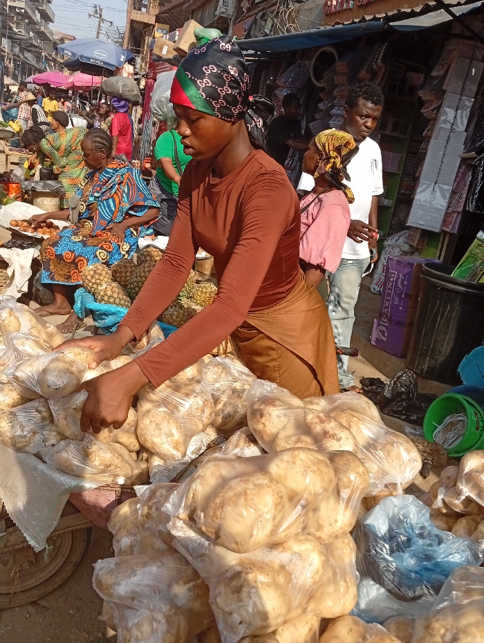 A bustling market scene depicts a woman with a headscarf tending to a large pile of what appears to be wrapped yams or root vegetables. She's wearing a brown top and skirt. Behind her, other vendors and shoppers are visible amidst colorful displays of goods. Pineapples are also seen near her stand. The market is crowded with various structures and people, conveying a lively, busy atmosphere.