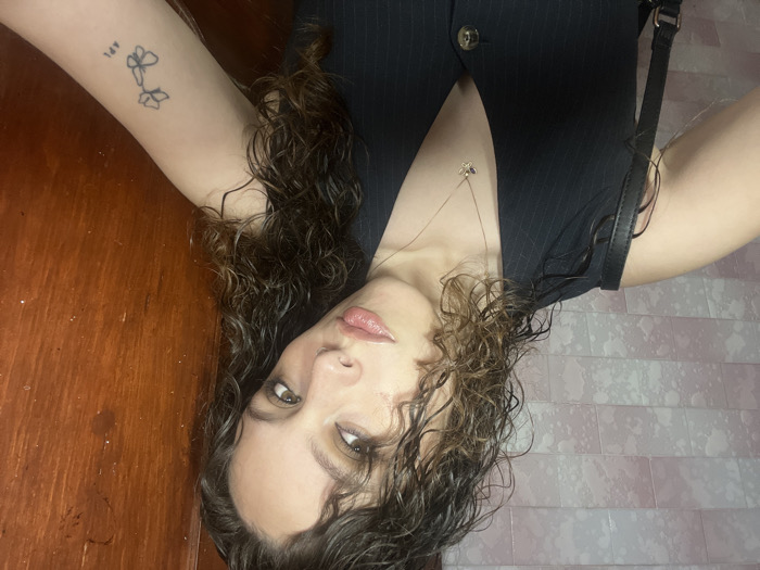 A woman with curly, shoulder-length brown hair poses for a selfie. She wears a black pinstripe vest over her bare skin with a delicate necklace. On her left arm, there's a small tattoo. The background is divided between a dark wood panel and pinkish-white brick-like tiles. The photo is taken from a slightly elevated angle, rotated counter-clockwise, with the woman gazing directly at the camera.
