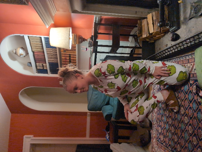 A person kneels on an oriental rug, wearing white pajamas with green Grinch faces. Brown slippers adorn their feet. The room is decorated with a fireplace and a bookshelf tucked into an arched alcove. A lamp sits on a side table in front of the bookshelf, and a blue chair is placed to the side of the person. The walls are painted a warm coral color, and a small dog is laying on the rug next to the person.