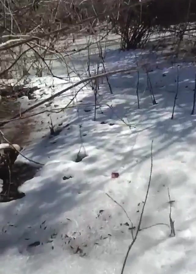 The camera pans across a snow-covered landscape in a wooded area. The ground is covered in a mix of snow and ice, with thin branches sticking out. Trees with bare branches are visible in the background under a bright blue sky. There are no people visible in the video.