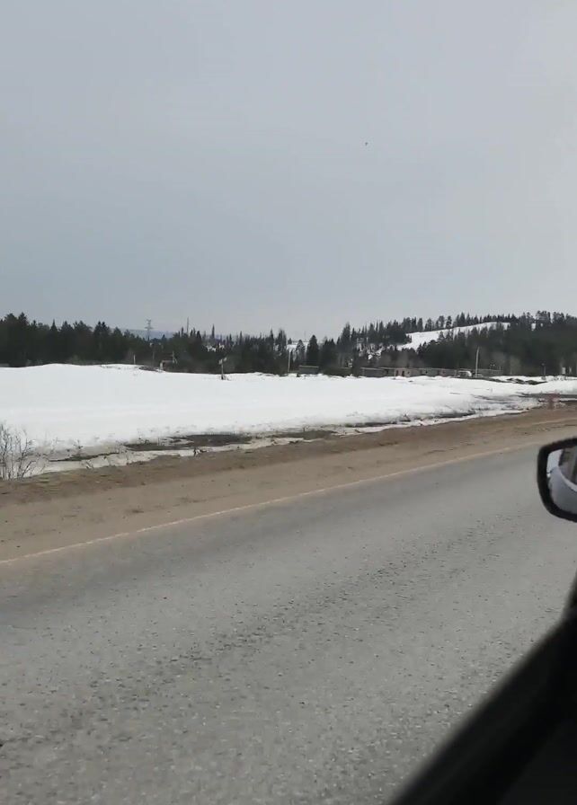 The video depicts a view from inside a moving vehicle, likely a car, traveling on an asphalt road. The landscape outside the window shows a snow-covered field adjacent to the road, with a line of trees visible in the distance. The sky is overcast, with a general grayness to the scene. The car’s side mirror is briefly visible, and the arm of someone wearing a black and white patterned shirt is seen momentarily obstructing the view. The primary focus is the wintery landscape passing by.