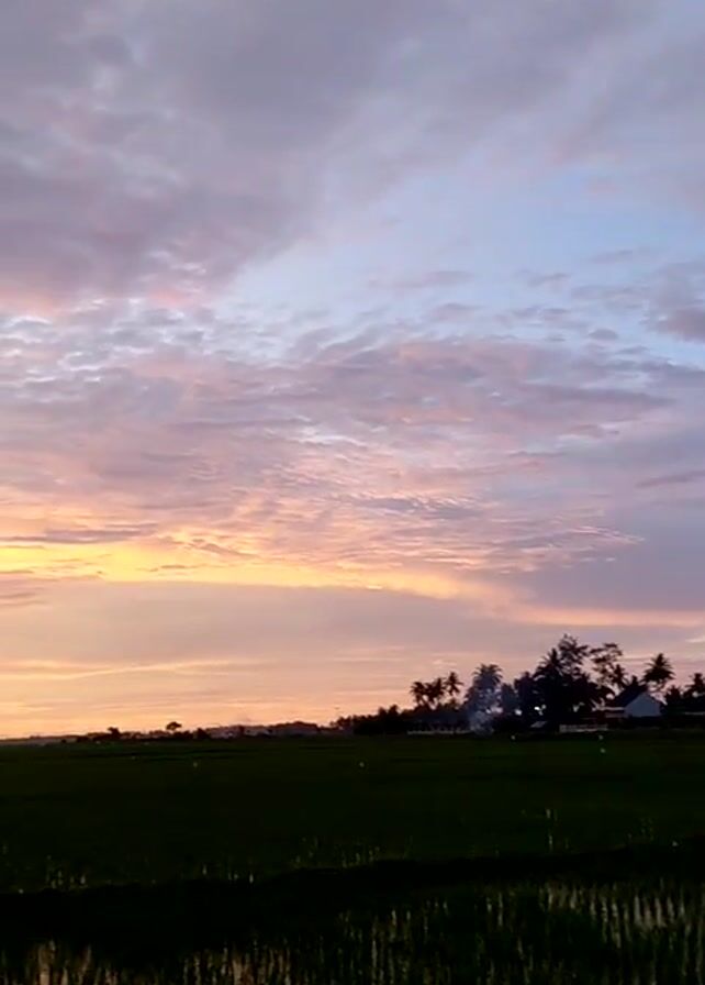 rural landscape at sunrise or sunset. The sky is filled with clouds, displaying a gradient of colors including yellow, orange, pink, purple, and grey. Below the sky, the silhouette of trees and possibly some houses are visible on the horizon. The foreground is dominated by a flooded rice field, reflecting the colors of the sky. The video appears to be shot from a static position, and there is no apparent movement of people or objects within the frame.