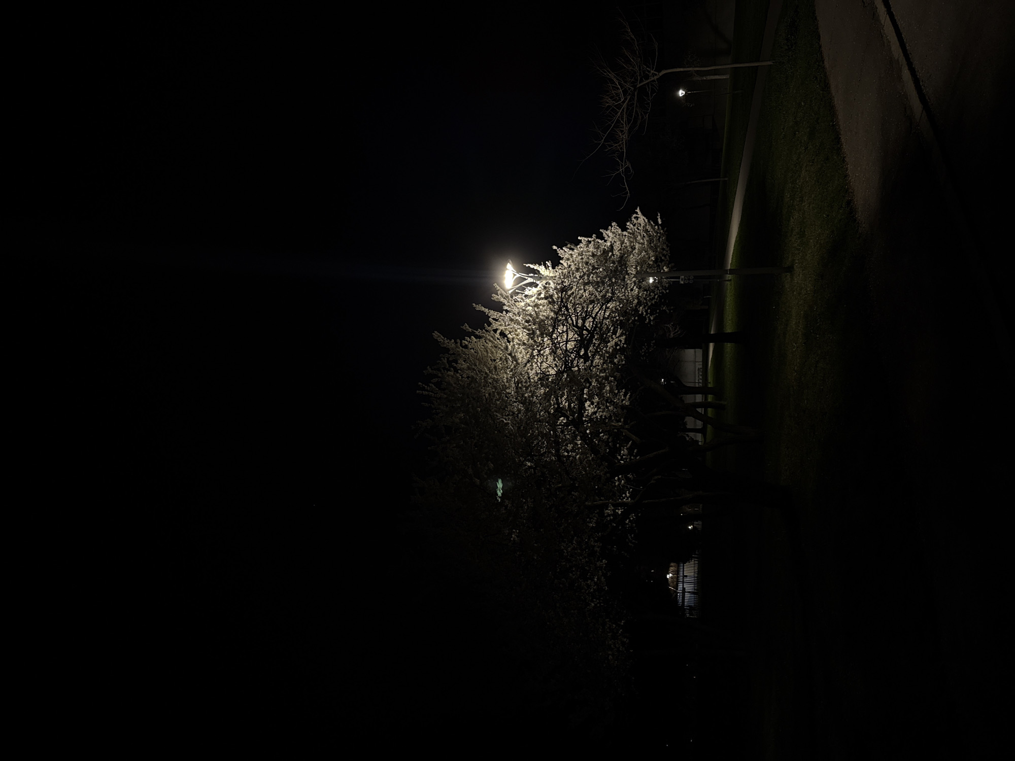 night scene in what appears to be a park in Sofia, Bulgaria. The scene is dominated by two trees illuminated by streetlights. The trees are covered in white blossoms or are frosted, giving them a bright, ethereal glow against the dark background. A streetlight is positioned above each tree. A narrow path or sidewalk is visible on the right side of the frame. A second, dimmer streetlight is visible further in the background, illuminating a small, bare tree. The rest of the scene is enveloped in darkness.