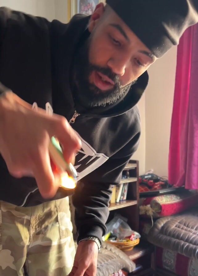 man with a beard and a black hat, wearing a black and white hooded sweatshirt and camouflage pants. He is indoors in a room that appears to be a bedroom. He is holding a lighter and demonstrating how to spark it. The room has a bed with patterned bedding, a small bookshelf, and pink curtains. Music is playing in the background.