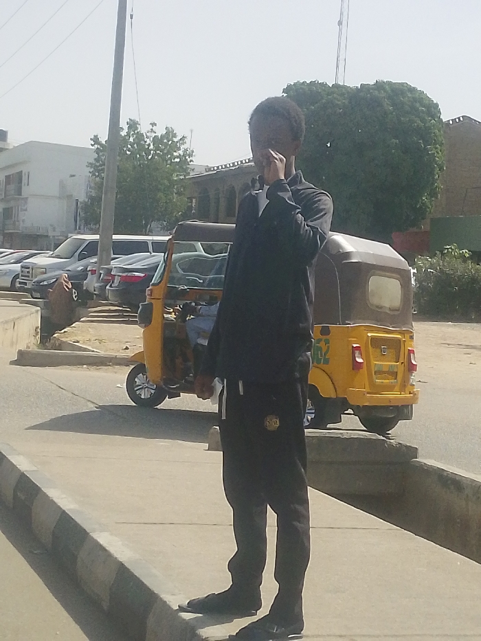 The scene depicts an outdoor urban environment in Gyadi Gyadi Arewa, Nigeria, under clear daylight conditions. A dark-skinned individual, appearing male, is standing in the foreground on a concrete sidewalk. This individual is dressed in a black long-sleeved top and black track pants featuring a white stripe on the left leg and a circular emblem on the upper thigh. Their right hand is raised to their face, obscuring the mouth and lower nose area, while their left hand holds a small white object. The sidewalk has a raised curb with black and white striped markings. In the mid-ground, a yellow and brown three-wheeled auto-rickshaw, commonly known as a "Keke Napep," is visible on a paved road, facing away from the camera. A number "162" is painted on its rear. A person is partially visible inside the driver's compartment. Behind the auto-rickshaw, several vehicles are parked, including a white SUV, a dark sedan, and a white stretch limousine-like vehicle, positioned beyond a low concrete barrier. The background features a multi-story white building on the far left and an older building with arched architectural details. Sparse green trees and shrubs are scattered throughout the background, with a prominent large, round-canopied tree on the right side. A tall, grey utility pole with overhead wires is visible on the left, extending towards a bright, somewhat hazy sky. Shadows are cast by the subjects and structures, indicating direct sunlight.