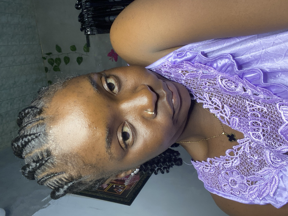 A dark-skinned woman faces the camera, wearing a lavender, lace-trimmed garment