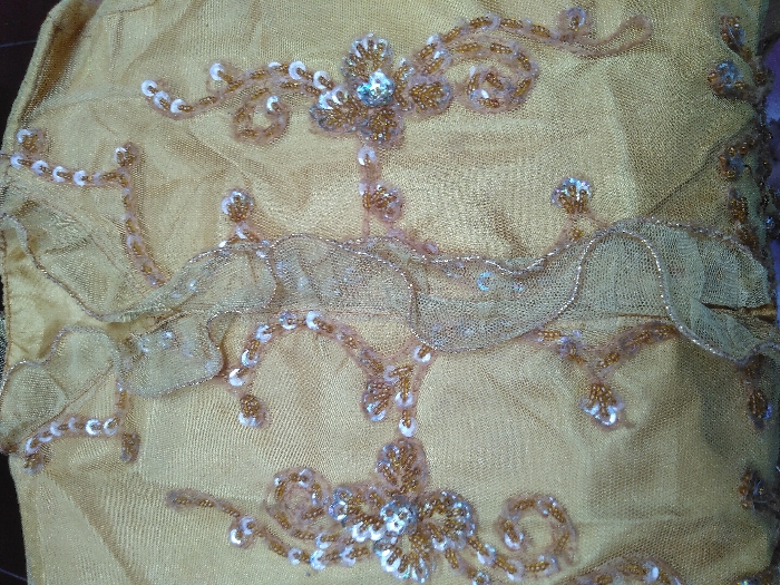 This image displays a close-up, top-down view of a golden-yellow, sheer textile, likely part of a garment, located in Pokhara, Nepal