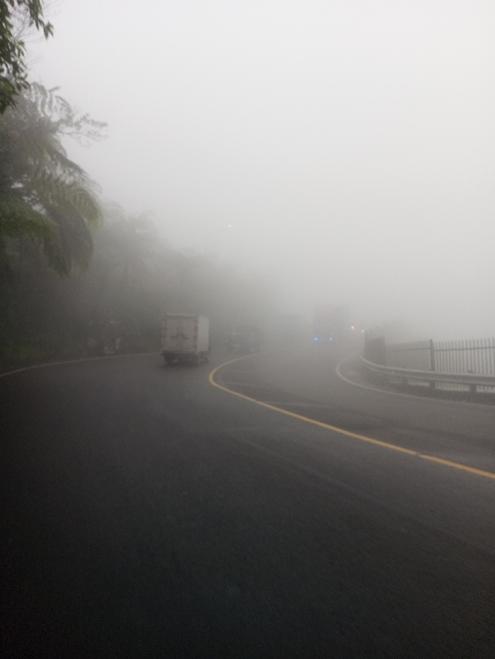 This image captures a foggy road scene in Siruppiddy, Sri Lanka