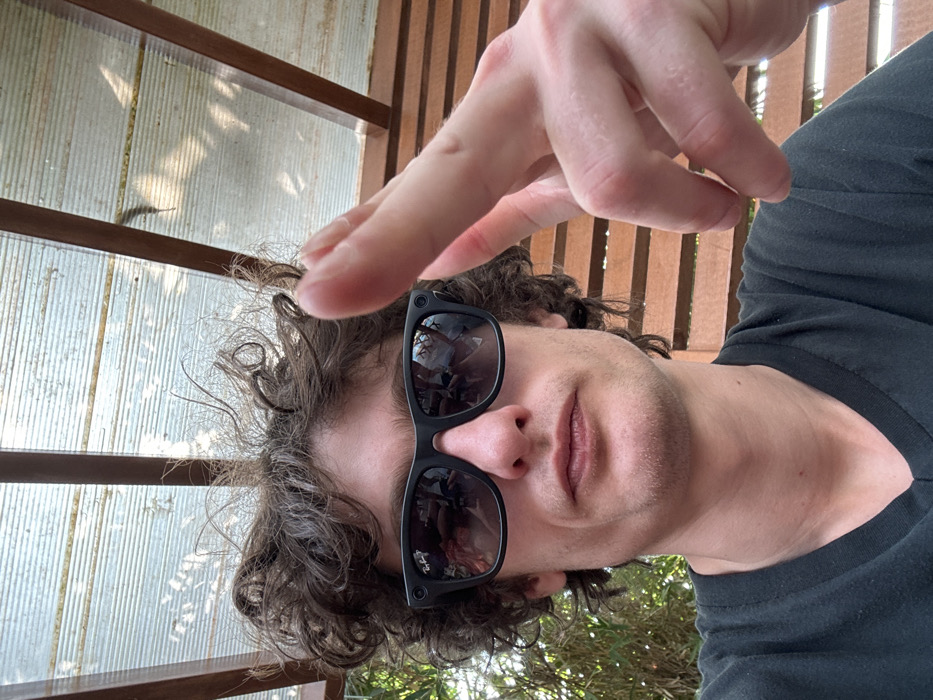 A fair-skinned man with curly brown hair and black sunglasses looks at the camera with a slightly smug expression. His right hand hovers near the top of the frame, fingers outstretched. He is wearing a dark t-shirt. The backdrop includes a wooden structure, possibly a chair or deck railing, and a glimpse of foliage suggesting an outdoor setting. The image is slightly rotated counter-clockwise.