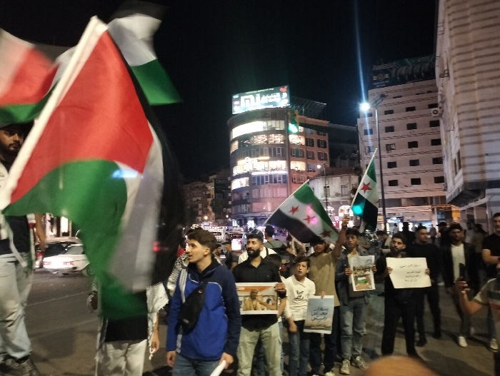 The image depicts a nighttime urban street scene in Homs, Syria, likely near a commercial hub such as Clock Tower Square, characterized by illuminated multi-story buildings. A group of approximately twenty to thirty individuals, predominantly male adults and several children, are gathered, suggesting a protest or demonstration. In the foreground, a large Palestinian flag (black, white, green horizontal stripes with a red triangle) is prominently displayed, partially blurred due to motion, held by an individual on the far left. Towards the center-right, two Syrian opposition flags (green, white, black horizontal stripes with three red stars in the white band) are visible, held aloft by two young males. Several participants hold signs and posters: * A young boy in the center holds a poster featuring a green background with a map-like outline and figures. * To his left, another individual holds a poster displaying a photographic image of a person. * Further right, a man holds a white sign with Arabic text. * Another sign with Arabic text is partially visible near the center. People are dressed in casual clothing, including jeans, t-shirts, and jackets. One individual wears a kaffiyeh draped over his shoulders. The background features several multi-story buildings; one large, rounded structure is heavily illuminated with numerous windows and a prominent "LG" sign visible on its upper facade. Streetlights provide additional illumination to the scene, and other vehicles are faintly visible in the background. The sky is dark, indicating night.