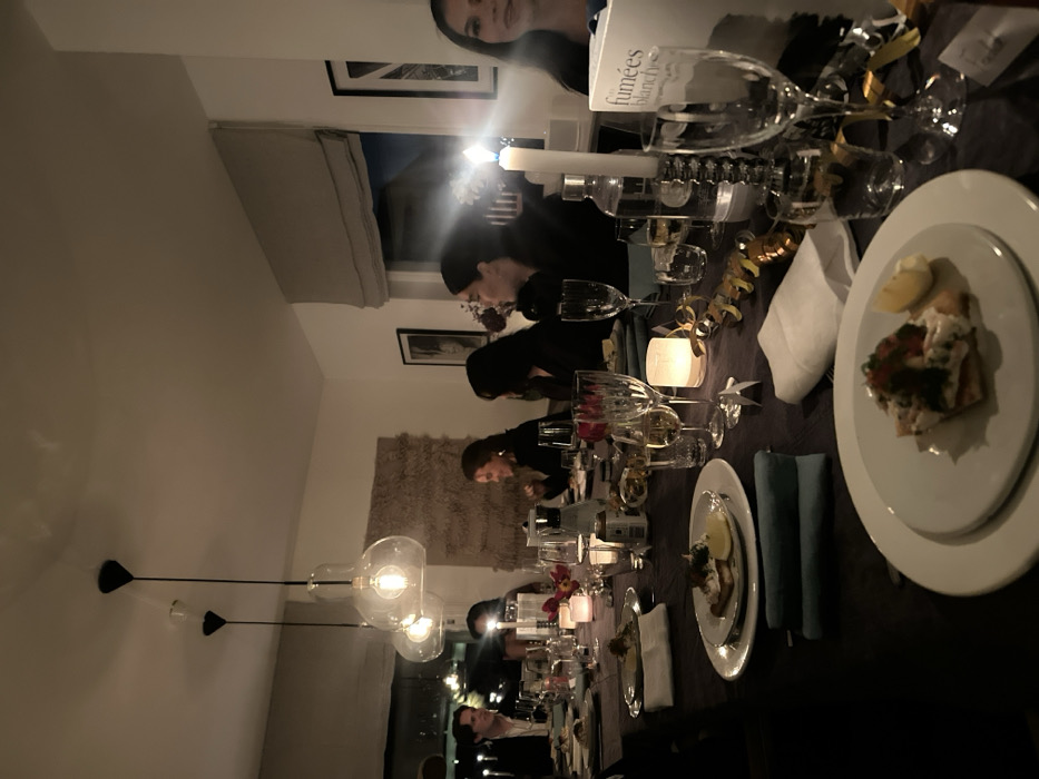 A dimly lit dining table set for a formal dinner is the focus, adorned with wine glasses, candles, and elegantly plated food. Guests are seated around the table, engaged in conversation and enjoying their meals. A modern chandelier hangs above, contributing to the warm ambiance. Through a nearby window, glimpses of a nighttime cityscape add depth to the scene. The setting suggests a celebratory or special occasion.