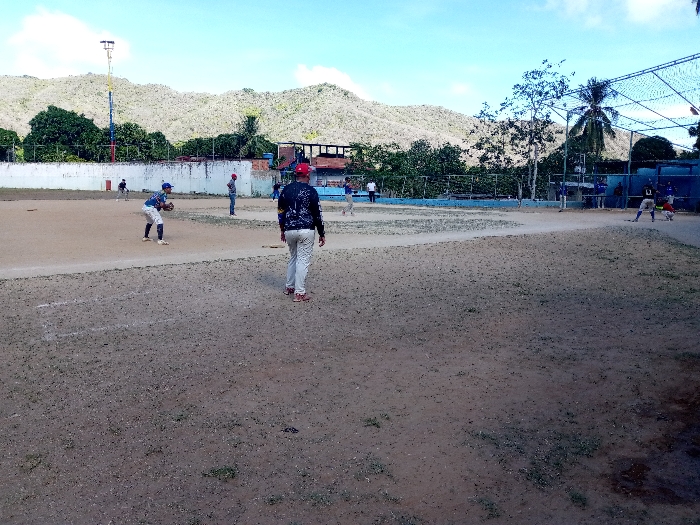 A baseball game in progress. Players in uniform are positioned on the field, one in the foreground preparing to throw the ball. Another player stands nearby. In the distance, other figures are visible. A backdrop of trees and a hill under a blue sky with scattered clouds frames the scene. A fence borders the field, and a netting structure is visible on the right side. The ground appears to be dirt and grass.