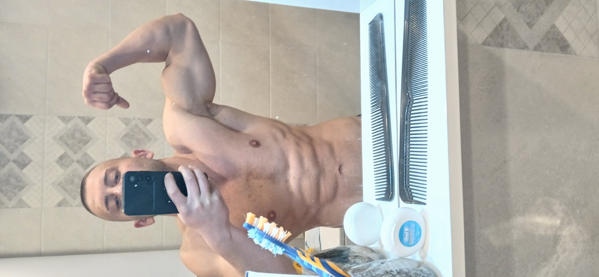 A shirtless man with a shaved head poses in a bathroom mirror, flexing his left bicep and holding a smartphone with a triple-lens camera in his right hand to capture the image. His body is visible from the chest down, revealing defined abdominal muscles. The background includes wall tiles and a shelf holding personal hygiene items such as toothbrushes, combs, dental floss, and a bar of soap. The location, Sliven, Bulgaria, cannot be determined from the visual information.
