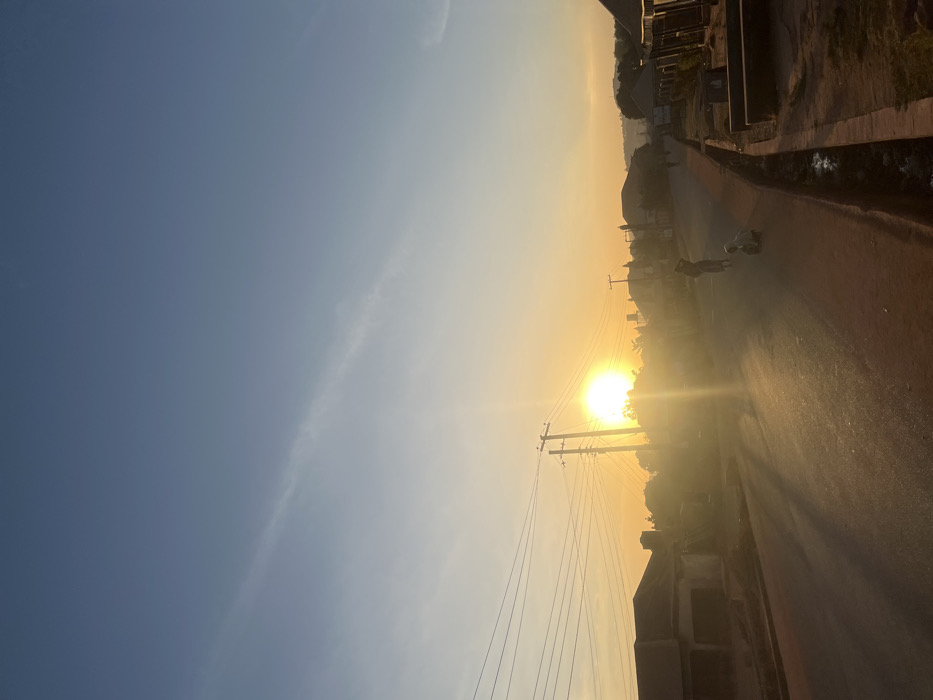 This image depicts a residential or semi-commercial street scene in Jos, Nigeria, during either sunrise or sunset, characterized by strong golden light and extended shadows. The upper two-thirds of the frame is occupied by a clear sky, transitioning from a light blue at the top to a bright yellow-orange near the horizon. A faint, thin white contrail extends diagonally across the upper left quadrant. The sun, a brilliant, haloed orb, is positioned in the mid-left of the frame, near the horizon line, emitting intense light and significant lens flare that obscures details directly behind it. The lower third of the image shows a paved asphalt road, appearing somewhat worn. Long, parallel shadows stretch across the road from left to right, originating from figures and objects on the left side. Utility poles with multiple overhead wires are visible on the left, silhouetted against the sun. Behind these, various buildings with orange-brown roofs are partially visible, some appearing residential. One structure on the far left appears to be an unfinished building with exposed concrete. On the road, in the mid-ground, two individuals are present. One person, an adult-sized figure, is walking or standing with their back partially turned, appearing to carry an object on their head. Near this individual, a smaller figure, consistent with a child, is crouched or seated directly on the road surface. Further down the road on the right, several other indistinct figures are visible, moving or standing. To the right of the road, a concrete drainage ditch runs parallel to the pavement, containing dark, still liquid. Beyond the ditch are low walls or fences, and the roofs of additional buildings, with hills or elevated terrain visible in the distant background under the glowing sky.