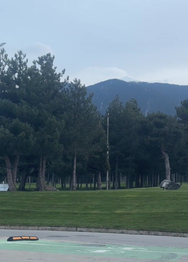 scene in what appears to be a park with a large grassy area, a line of evergreen trees, and snow-covered mountains in the background under a cloudy sky. A paved area with parking bumpers is in the foreground. The camera slowly pans to the right, revealing more of the snow-covered mountain range.