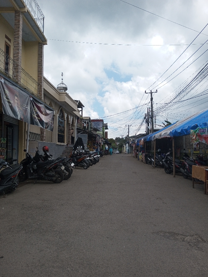 The image displays a bustling street scene in Tagtse Tashidingkha, Bhutan, under a partially cloudy sky
