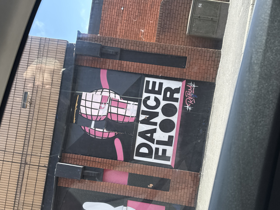 The image displays the exterior of a building in Preston, United Kingdom, captured from an elevated perspective, likely inside a vehicle, evidenced by the lower frame and reflections. The primary subject is a large mural applied to a black surface on the building's facade, which is primarily constructed of red-brown brick. The mural's upper section features abstract, stylized artwork composed of pink and white checkered spherical shapes connected by a curving pink line. This artwork exhibits some signs of wear, including minor tearing or peeling. Directly beneath this, in prominent white block capital letters, is the word "DANCE" stacked above "FLOOR," with a thin pink horizontal line underneath the text. At the bottom right of the black mural section, a graffiti tag is visible, rendering "#REASM" in white with blue detailing. To the right of the mural, the building wall continues with exposed red-brown brickwork. A grey utility box, approximately waist-height, is affixed to this brick section, bearing the number "56." Above the main facade, an upper section of the building features a uniform pattern of light beige rectangular tiles or bricks. A thin dark wire descends vertically from this upper section. The ground directly in front of the building consists of light grey pavement. A clear blue sky is visible in the upper right quadrant of the image, although parts of the upper building and sky are partially obscured by reflections on the glass through which the photograph was taken. No individuals are visible in the scene. The lighting suggests a bright, sunny day.