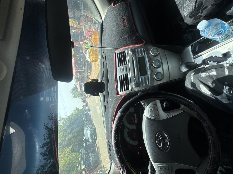 The image captures a scene from the interior of a vehicle, specifically a Toyota Camry, looking outwards through the windshield onto a street in Dutse, Nigeria