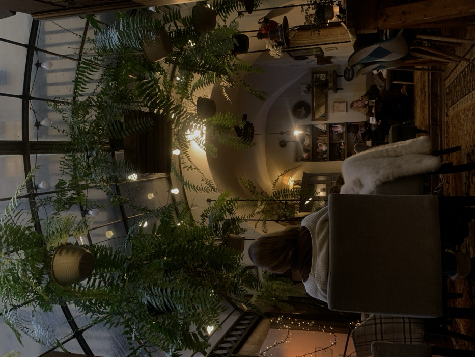 The image depicts the interior of Cheder Cafe, located in the Kazimierz district of Krakow, Poland. The scene is an indoor, dimly lit establishment characterized by two distinct architectural sections. In the foreground and overhead, a glass-paneled ceiling, resembling a greenhouse, is visible. From this structure, numerous large Boston ferns are suspended in a variety of hanging planters, including woven wicker and wooden box designs. Strings of bare-bulb incandescent lights are strung across the glass panels. A female individual with shoulder-length brown hair, wearing a light-colored sweater over a dark top, is seated in the foreground with her back to the camera. She occupies a gray upholstered dining chair. A white, fuzzy garment is draped over a chair to her right. A patterned rug covers the floor in this area. The background transitions into a vaulted, arch-ceiling section with warmer, more enclosed lighting. Walls in this section display several dark wooden shelving units laden with books, ceramic items, and various decorative objects. Two individuals are seated on a dark sofa at a low table in the mid-background: one person with blonde hair is observed eating from a white plate, and another, wearing a hat, sits beside them. On the far right, several dining chairs with a distinct blue and white diamond pattern are visible. The overall environment is decorated with numerous potted plants and warm, ambient lighting.