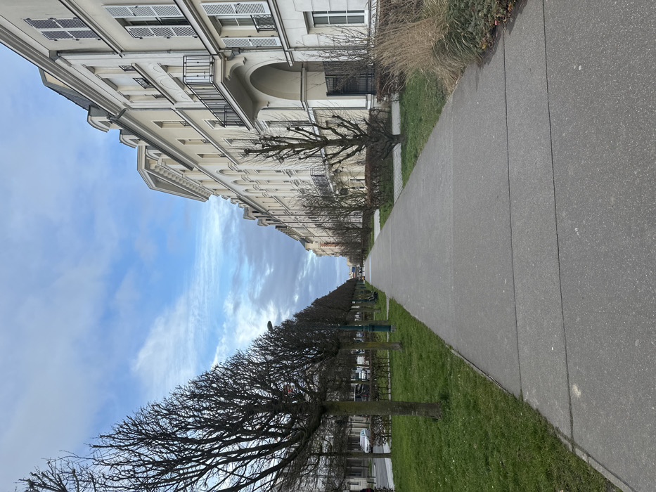 The image depicts a long, straight concrete pedestrian walkway in Serris, France, extending into the distant background under a partly cloudy sky. To the left of the walkway is a narrow strip of green grass, followed by a uniformly spaced row of deciduous trees, currently bare of leaves, indicating a cold season. Beyond these trees, a paved street with several parked cars is visible further down the perspective. Green streetlights are interspersed along the tree line. To the right of the walkway, another strip of grass features sparse, dry ornamental grasses and bare trees. Adjacent to this is a multi-story building with a light-colored facade, featuring numerous windows, many equipped with closed white louvered shutters. Several dark-colored metal balconies are present, and an arched entrance is visible on the ground level of the building closer to the foreground. The building exhibits classical architectural elements, including cornices and a mansard roof with dormer windows. No individuals or active movement are discernible within the visible scene.