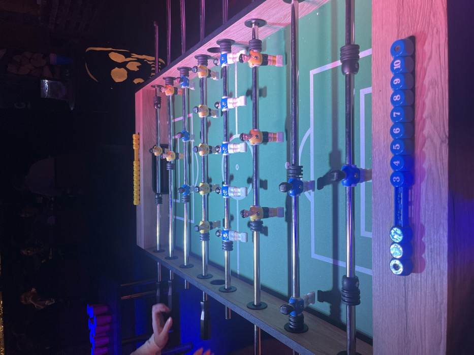 The scene depicts an active foosball game within a dimly lit recreational venue in Minsk, Belarus
