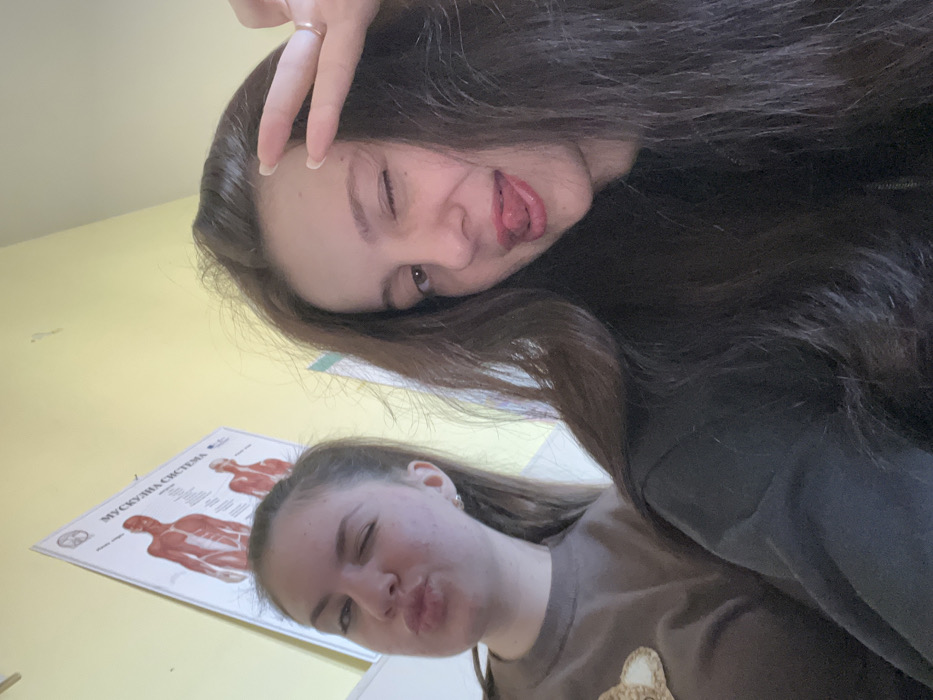 The image displays two young females posing for a photograph indoors in Cherven Bryag, Bulgaria. The subject on the left, with light brown hair pulled back, wears a brown long-sleeved shirt. She winks her left eye and puckers her lips. The subject on the right, with long dark hair, wears a dark long-sleeved top. She winks her right eye, extends her tongue, and forms a peace sign with her right hand near her temple, displaying a ring on her right ring finger. The background consists of a light yellow wall. Mounted on the wall to the left is a white poster with Cyrillic text reading "МУСКУЛНА СИСТЕМА" (Muscular System), illustrating human anatomical diagrams. A white vertical surface is visible on the far left. The scene depicts a playful interaction in an educational or institutional environment.