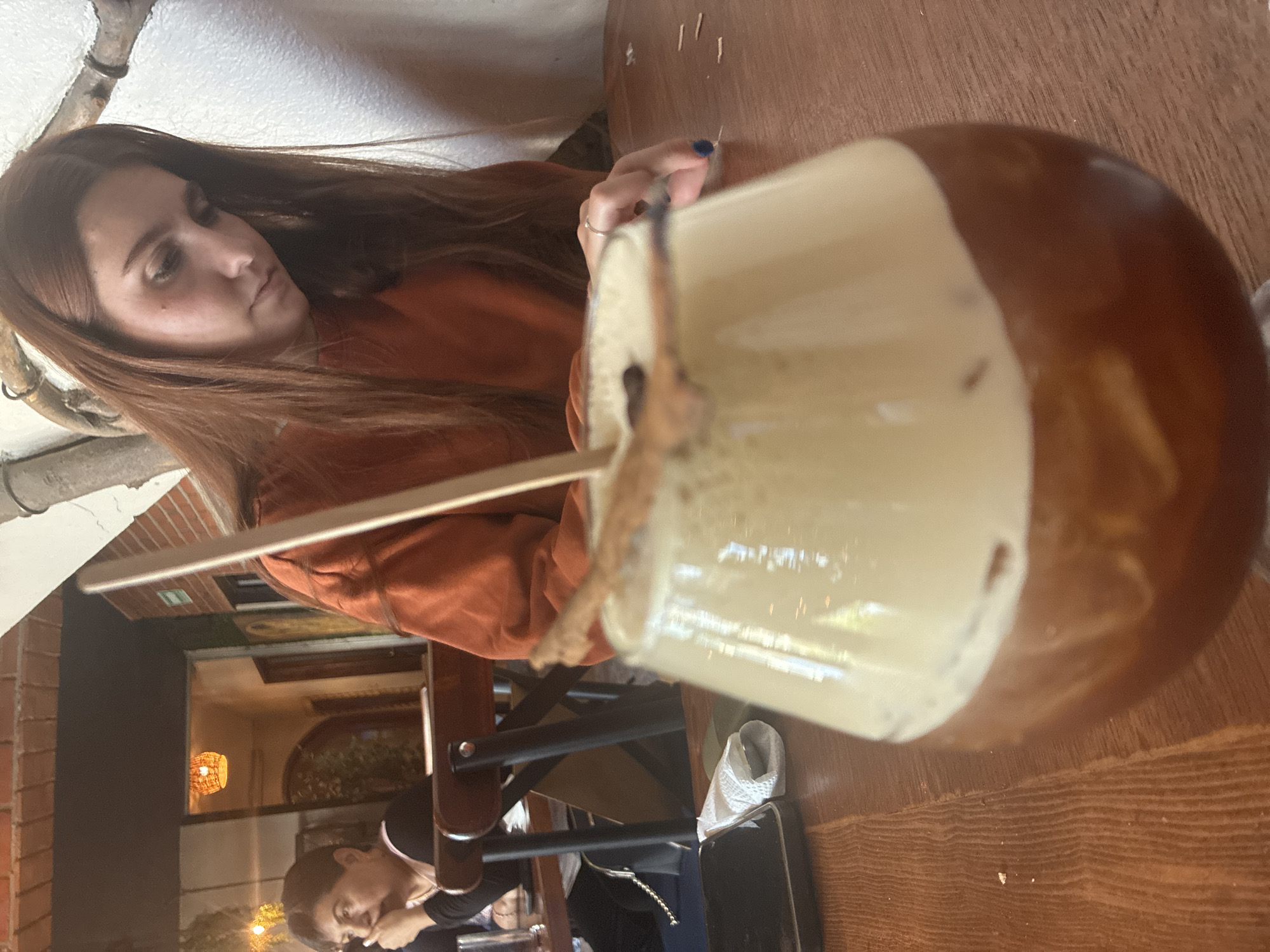 A woman with long brown hair wearing an orange sweater sits at a wooden table in an indoor setting in Tepeji de Ocampo, Mexico. She is looking at a large glass of light-colored liquid with a dark rim. A thin wooden stick is in the glass. Another person is partially visible in the background. A cellphone and a white object are on the table. There is a brick wall, windows and a decorative lamp.