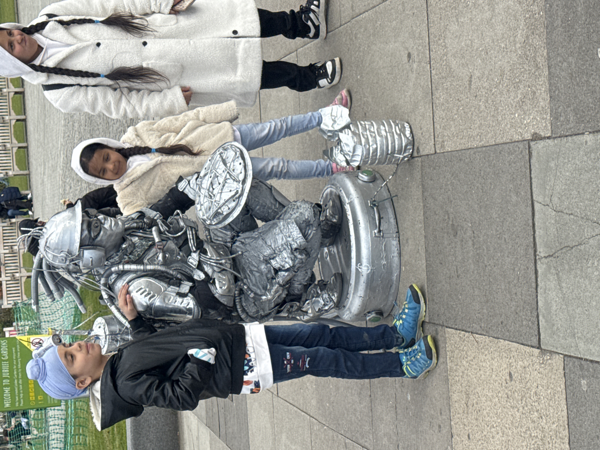 The image captures three children interacting with a street performer dressed in a silver robotic costume. The performer is lying on their back on a grey paved surface, likely a sidewalk, with their metallic legs extended towards the bottom of the frame. A young girl in a tan fleece hooded jacket and light blue jeans is lying near the performer, her legs partially covered by a metallic structure associated with the costume. A young girl is positioned above her, wearing a white hooded coat and black pants. A young boy in a blue turban, a black jacket with a white lining, blue jeans, and blue sneakers is lying next to the performer, his hand touching the robotic costume. Behind the subjects, there's a glimpse of green vegetation, possibly a park or garden. A sign reading "WELCOME TO JUBILEE GARDENS" is partially visible in the background. The overall setting appears to be a public space, possibly in the Jubilee Gardens area in London, United Kingdom, given the signage.