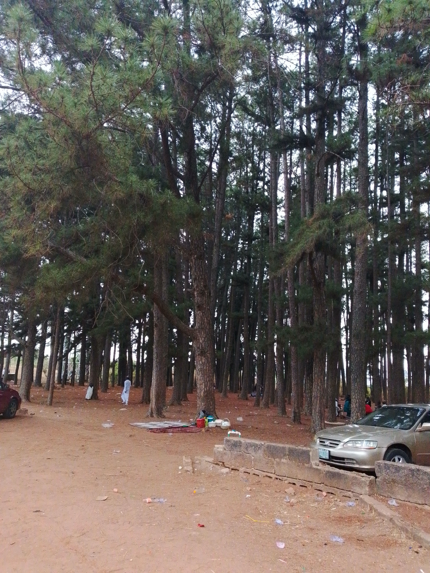 The image depicts a grove of coniferous trees in Jos, Nigeria. The scene features a sandy ground littered with debris, including plastic bottles and paper. A car is parked near a low concrete barrier. People are scattered among the trees. Some are standing or walking, and some are sitting or lying on mats. One person is wearing a white garment.