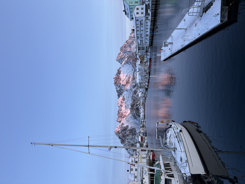 The image depicts a winter scene within the harbor of Henningsvær, Norway, characterized by a narrow waterway flanked by snow-dusted structures and prominent snow-capped mountains in the background. The sky is clear and light blue. In the foreground, a white sailboat with a tall mast is moored on the left, its deck lightly covered in snow, with its reflection visible in the dark, calm water. A smaller white motorboat is partially visible behind the sailboat. To the foreground right, a snow-covered floating dock, equipped with two short white posts and a railing leading to a gangway, extends into the waterway. The waterway itself is dark blue, reflecting the sky and the pink-hued mountain peaks. Both sides of the channel are lined with an array of buildings, predominantly white or pale-colored, with some featuring red or blue accents, consistent with traditional Norwegian coastal architecture. Several smaller boats, appearing to be fishing vessels, are moored along the docks adjacent to these structures. The background is dominated by a rugged mountain range, heavily covered in snow. The highest peaks of these mountains are illuminated with a distinct pink or reddish glow from low-angle sunlight, suggesting either sunrise or sunset. This pink light is also reflected on the surface of the calm water. No individuals are present in the scene.