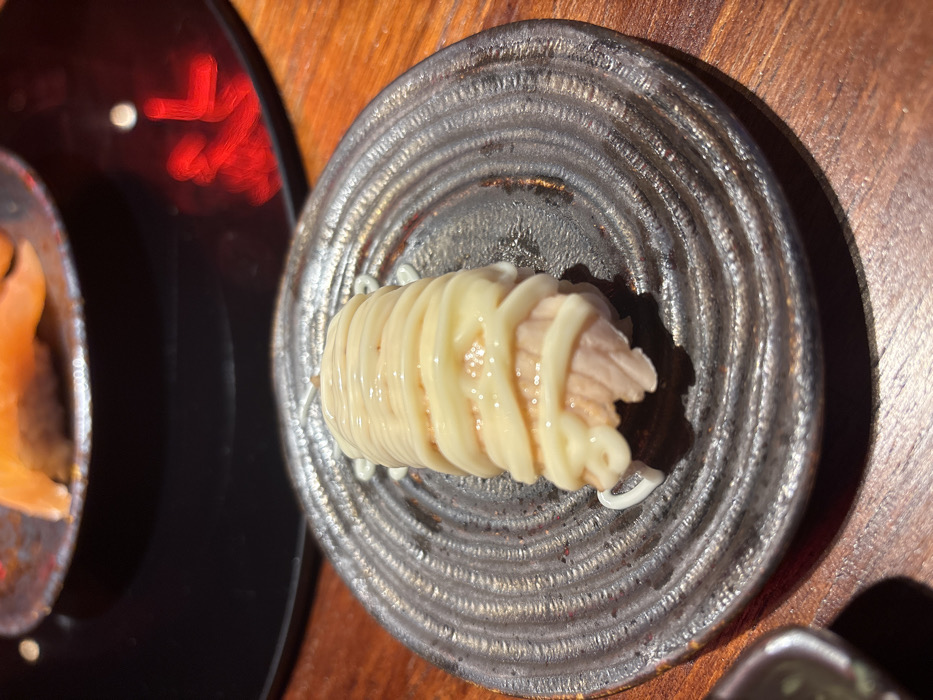 A single piece of nigiri sushi is centered on a dark, circular, textured ceramic plate. The sushi comprises a light-colored fish, consistent with salmon, over rice, extensively topped with a pale yellow, creamy sauce applied in horizontal, wavy lines. A small drip of the sauce is present on the plate below the sushi. The plate rests on a reddish-brown wooden table surface. In the blurred background, another dark plate holds additional salmon sushi. A distinct red reflection, appearing as stylized characters, is visible on a black surface in the deep background. A small, dark, square condiment dish is partially visible in the lower-left foreground. This scene is situated in a restaurant environment in Bangkok, Thailand.