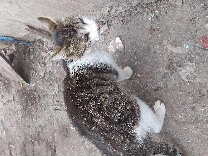 - "An outdoor scene in Kameno, Bulgaria, depicts a domestic cat standing on uneven, dark greyish-brown soil mixed with fine gravel and scattered debris" by FM-373nw1, licensed under CC BY 4.0