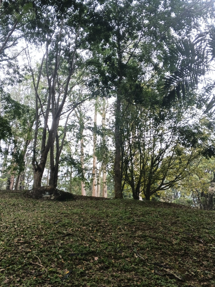 The image depicts an upward-sloping, vegetated terrain in Lalitpur, Nepal, characteristic of a natural park or wooded area. The foreground is covered by a dense layer of green grass intermingled with brown and green leaf litter, exhibiting visible roots and small debris. The slope ascends towards a dense collection of trees varying in species, height, and foliage density. Tree trunks are visible, ranging from dark brown to notably pale, almost white, with several slender, light-barked trees prominent in the background. The tree canopy comprises both dense, dark green foliage and lighter, sparser leaf growth. A large, dark green palm frond is partially visible in the upper right corner. The sky, seen through the canopy, is uniformly bright and overcast. No human subjects, artificial structures, or discernible activities are present within the frame.