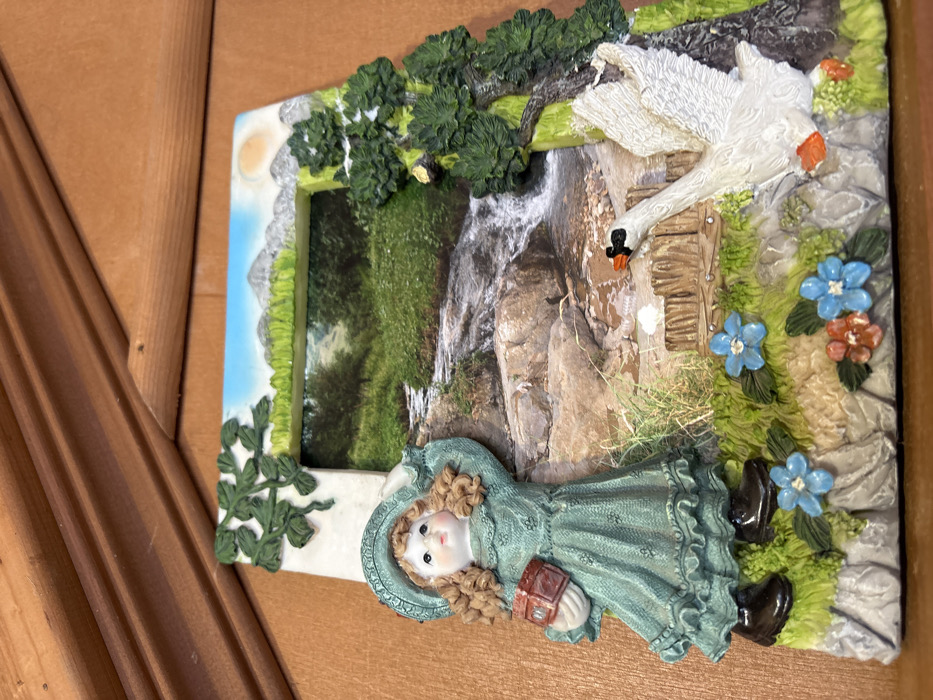 A decorative photo frame featuring a picturesque scene. A swan is perched near a waterfall. A girl in a blue dress is lying at the bottom of the frame, holding a small gift. The frame is adorned with flowers, green foliage, and what appears to be a small wooden door. The frame is placed on or against a light brown wood surface.