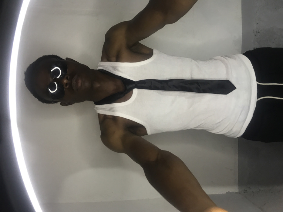 A dark-skinned male individual, appearing to be in his twenties, stands centered against a plain white wall with a darker, possibly gray, floor visible at the bottom. The precise location within Kirana, Nigeria, is not identifiable from the visual content. The individual is wearing a white sleeveless tank top, dark oval-shaped sunglasses that obscure his eyes, and black pants with a visible white drawstring. A black necktie hangs loosely around his neck, resting on the white tank top, untied. His arms are extended horizontally outwards to his sides, with the forearms and hands extending beyond the frame's edges. A bright, circular light source, consistent with a ring light, is prominently reflected in both lenses of his sunglasses and partially frames the top of his head. The scene is indoors, illuminated by direct, strong frontal lighting.