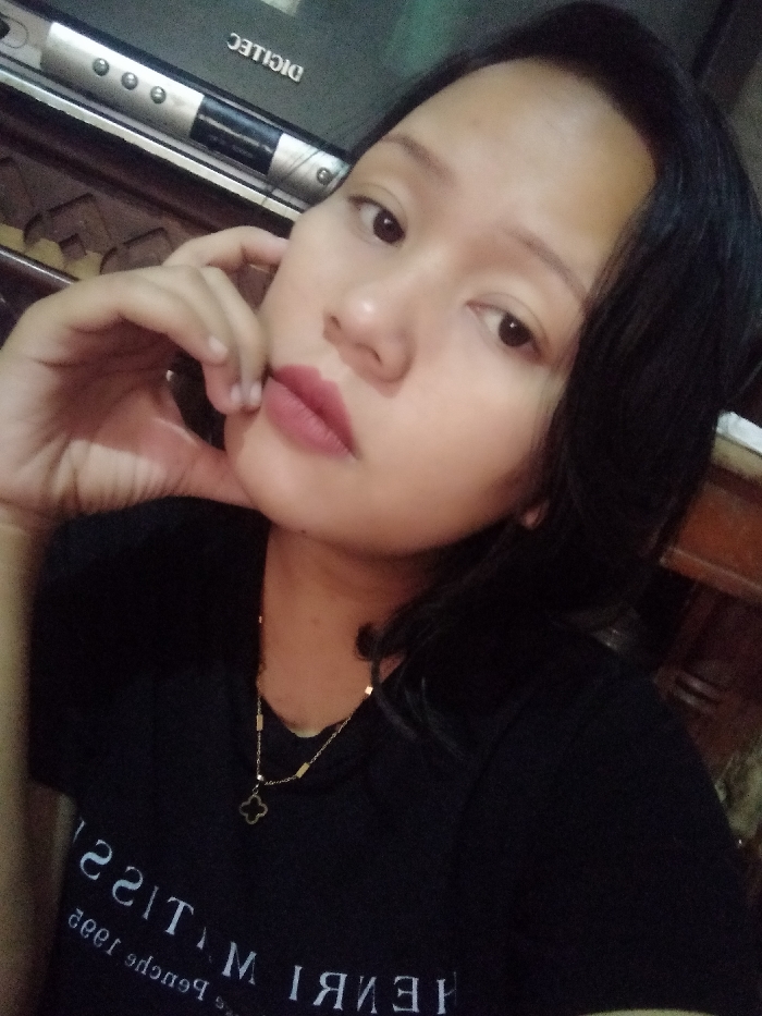 A young woman with dark hair poses in a selfie. Her lips are painted a muted rose shade. She wears a black T-shirt with white text, and a gold necklace with a clover pendant. Her hand is near her face, with fingers resting on her cheek. The background includes furniture and a piece of equipment labeled "DIGITEC".
