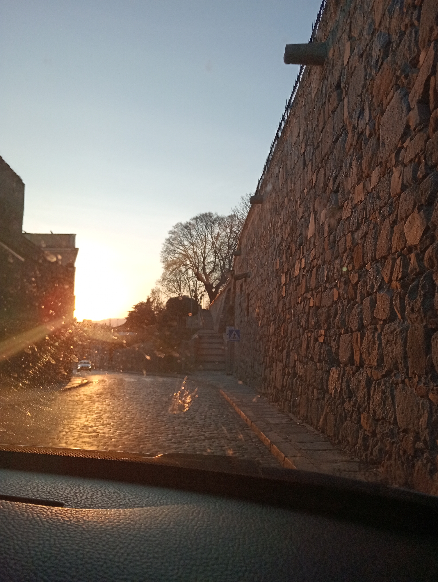 The image, captured from inside a vehicle looking through its windshield, depicts a street scene at sunset or sunrise in Ávila, Spain. The most prominent feature on the right is a massive, rough-hewn stone wall, characteristic of the Walls of Ávila, constructed from irregularly shaped grey and brown blocks. This wall extends vertically and horizontally out of frame, with two dark, rectangular stone protrusions resembling drainage spouts or gargoyles near its top edge, and a line of spike-like anti-climb deterrents along its upper perimeter. A narrow, paved sidewalk runs along the base of this wall. To the left, a partial view of a dark, multi-story stone building with a structured architectural element, possibly an archway or gate tower, is visible. The sun, a bright white-yellow orb, is low in the sky, positioned behind or to the left of this building, causing significant lens flare and scattered light reflections on the windshield, which also appears to have moisture droplets. In the foreground and midground, a cobblestone road, appearing wet and highly reflective due to the low sun's direct illumination, curves slightly. A single white car with its headlights illuminated is visible in the distance on this road, heading away from the viewer. In the background, positioned between the left building and the large stone wall, a large, bare deciduous tree with intricate branches stands prominently. Below it, a set of stone steps ascends, and a blue pedestrian crossing sign is visible near the base of the tree and steps. The sky transitions from a pale blue at the top to a brighter, lighter hue near the horizon. No discernible human figures are present in the scene.