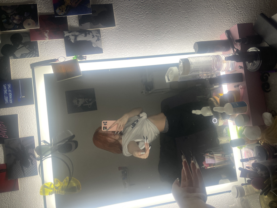 The scene depicts an interior space, identified as being in the city of Engels, Russia, captured through a mirror reflection. A young individual with shoulder-length reddish-orange hair is visible in the mirror, holding a light pink smartphone with their right hand, taking a selfie. They are wearing a white t-shirt knotted at the midriff, exposing the abdomen, and dark pants or leggings with a visible grey waistband of underwear. The individual's left arm is extended towards the mirror, with long, pointed, light-colored fingernails prominently displayed. A separate hand, consistent with the individual's, is partially visible in the lower-left foreground, also displaying similar long, light-colored nails. The rectangular mirror is framed by two vertical LED light strips on its left and right sides, providing primary illumination. Beneath the mirror is a pink-colored vanity surface. Arranged on this surface are multiple items, including two clear plastic water bottles with white caps, various white and clear bottles (some appearing to be cosmetic or hair products), a collection of makeup brushes in a holder, a black hairbrush, a black rectangular object (possibly a wallet or small notebook), and several small, dark circular objects. The wall surrounding the mirror is light-colored and textured, adorned with numerous printed images and posters. These include black and white photographs of people, an image of a spider in a web, abstract designs, a skeletal figure, and text-based prints such as "SWEET DREAMS ARE MADE OF THIS" and "BOMBY." Yellow hair clips and a small brown book attached to a lanyard with a green charm are suspended from the top edge of the mirror frame. In the background reflected within the mirror, a dark, plush piece of furniture, consistent with a bed or sofa, is visible against a light-colored wall. The overall lighting is bright and direct, emanating from the mirror's integrated lights.