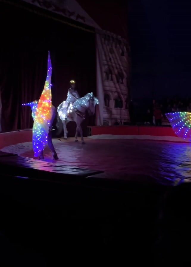 In the darkness of a circus, two performers holding wing-like props lit with colorful lights stand in the ring as a white horse, also covered in lights, is ridden slowly toward them