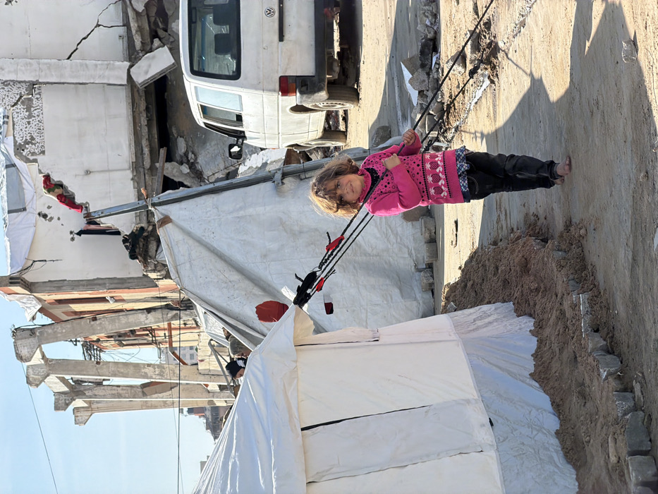 Against a backdrop of earthquake-ravaged buildings and a white tent city, a young girl in a pink sweater and dark pants plays on a makeshift swing