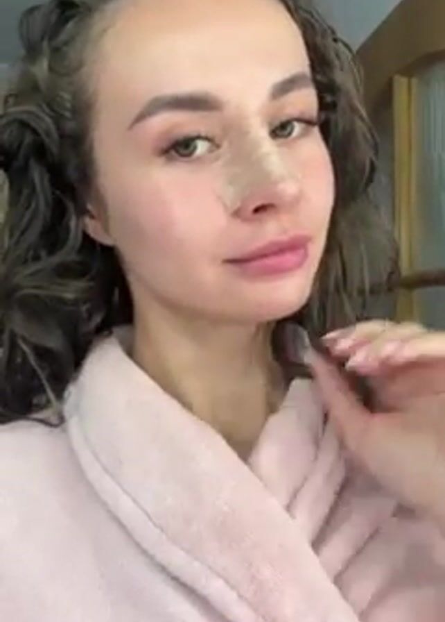 A fair-skinned woman with long, brown curly hair is standing indoors, wearing a pink, fleece bathrobe. She has a bandage on the bridge of her nose and is touching it with her left hand. She runs her right hand through her hair. Her lips appear to be slightly plumped, and she has light makeup on her face. The background includes a doorway with frosted glass and a light-colored wall.