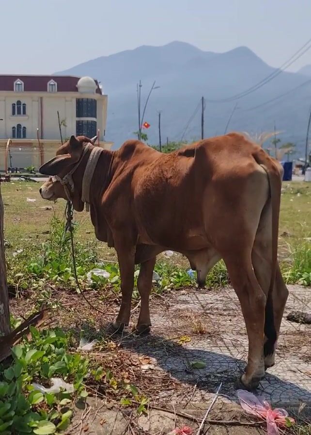 brown cow standing on a patch of grass and concrete in a sunny outdoor environment. The cow is tied to a wooden post with a rope around its neck. In the background, there's a building, mountains, and power lines visible under a clear blue sky. Scattered litter is present on the ground around the cow.
