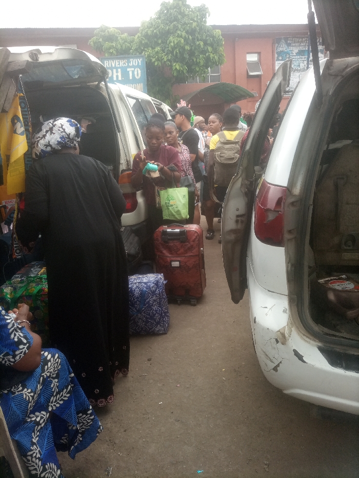 A bustling scene shows people gathered around two parked vehicles with open trunks. Luggage, including a large red suitcase and a blue patterned bag, sits on the ground. Passengers prepare for travel, some carrying shopping bags. A woman in a long black dress stands near the back of one vehicle. A sign for “Rivers Joy” is visible in the background, potentially indicating a travel company or destination. The white vehicle has visible damage on its rear bumper.