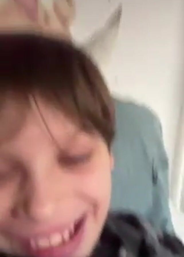 A young boy is lying down and appears to be crying, then smiles and waves to the camera