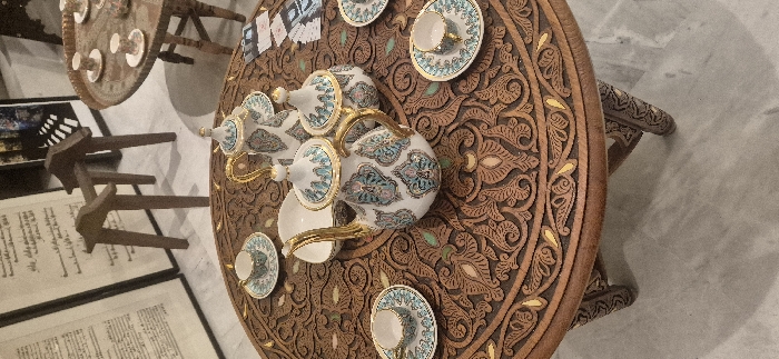 An ornate round wooden table with carved details holds a white and gold tea set with four matching cups and saucers. The table's design features intricate patterns with small gold accents. Next to the table are framed documents or calligraphy, and another similarly designed table stands in the background, partially visible. The floor is a light-colored marble or tile.