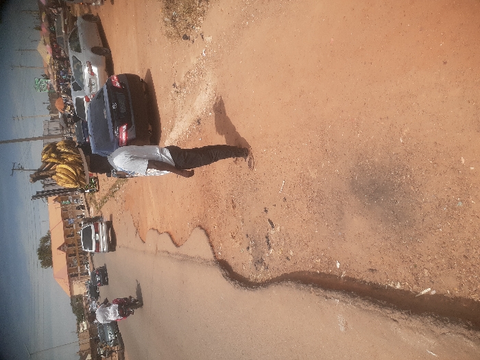 This image captures a daytime street scene in Gura Top, Nigeria, featuring a mix of paved road and unpaved reddish-brown dirt