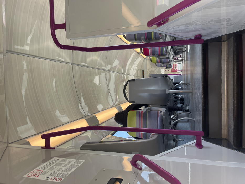 interior of a train car, looking down the aisle from the back to the front. It appears to be a French train as it has a sign near the back of the car with French text and the French flag. The car has a light gray ceiling and white walls with pink accents. There are multiple rows of seats on each side of the aisle, with the seats on the right side being further from the camera. The car is mostly empty, with only one person visible in the distance, sitting facing the front of the car. The person is wearing a black jacket, gray pants, and a light blue shirt. There is a large, gray-colored staircase in the foreground of the image with pink railings. The coordinates (latitude: 48.739, longitude: 2.279) indicate that the train is in Antony, France.